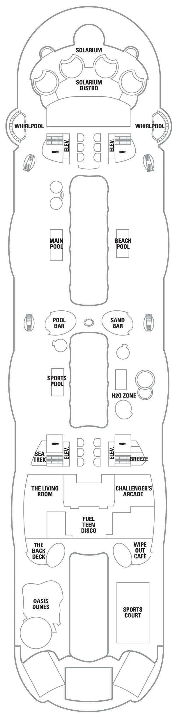 There are still a few shops, and a bar, but most of the deck is taken up by multiple massive swimming pools with big colorful slides. There are four hotubs in the back and several people all over, everywhere. It's like this, and you are currently at the back elevators! ]